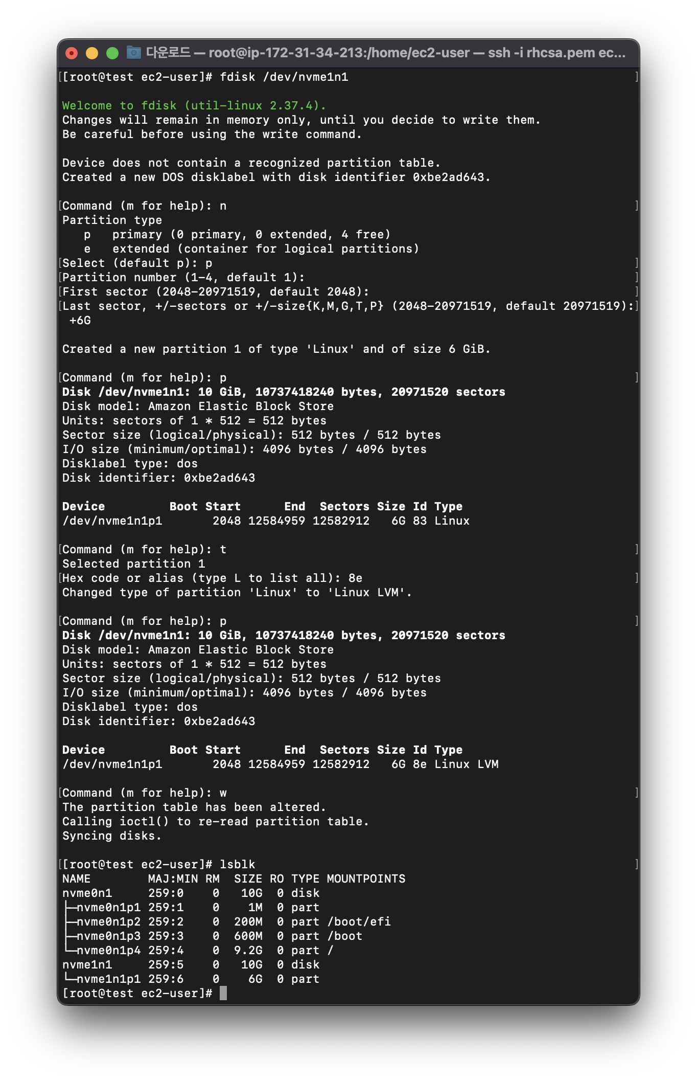 t : 파티션 시스템 id 변경 (8e : LVM)