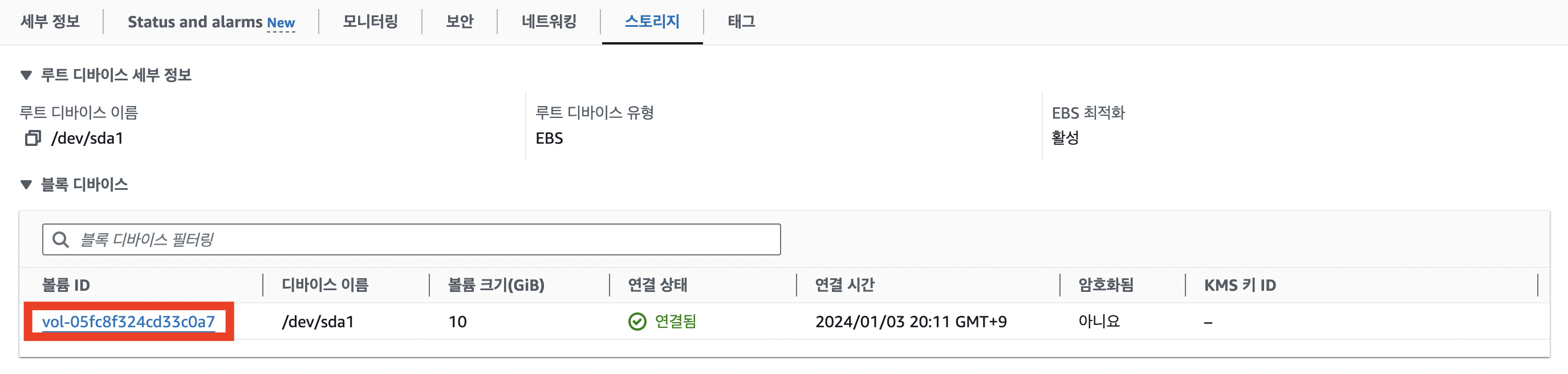 1. ec2> 인스턴스> 스토리지 볼륨 ID 클릭