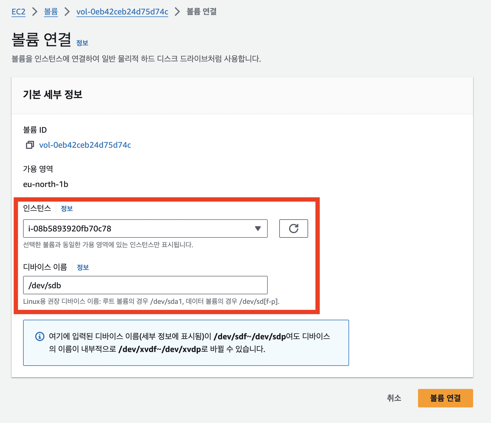 5. 인스턴스 선택 후 디바이스 이름 입력 ( sdb로 함)>볼륨 연결