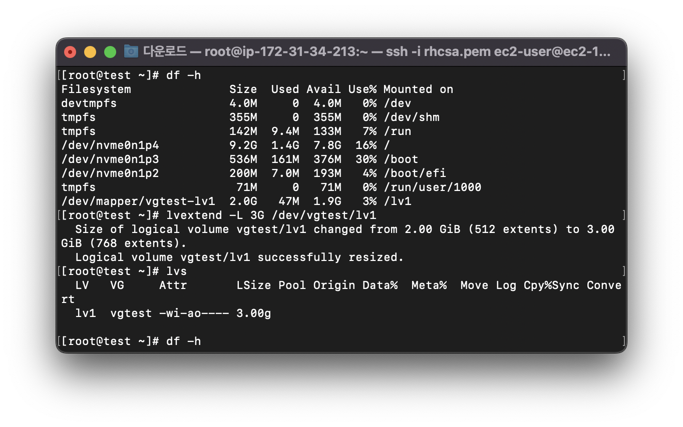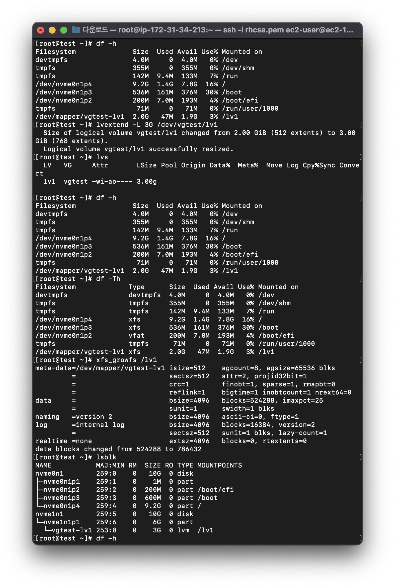 - pv,vg,lv, 생성 후 파일시스템 생성 및 마운트