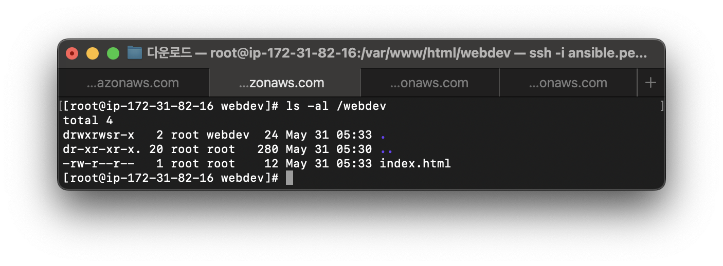 - /webdev 권한 확인 : webdev 그룹, 2755 권한 확인