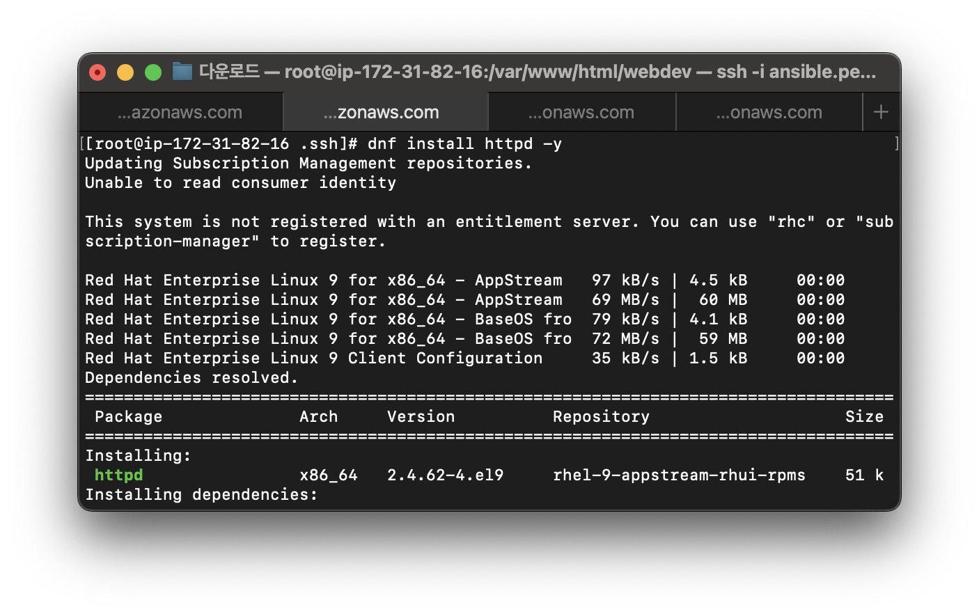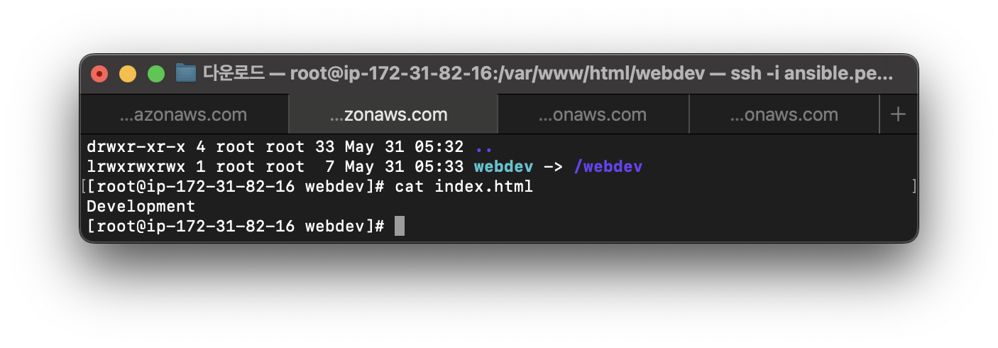 - 플레이 북은 dev 호스트 그룹의 관리 노드에서 실행됩니다.