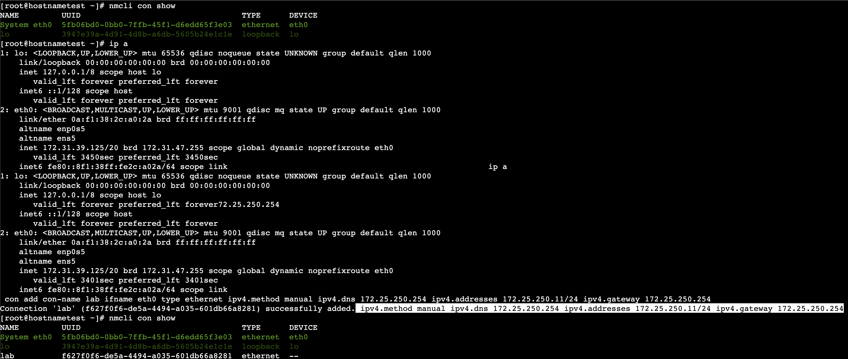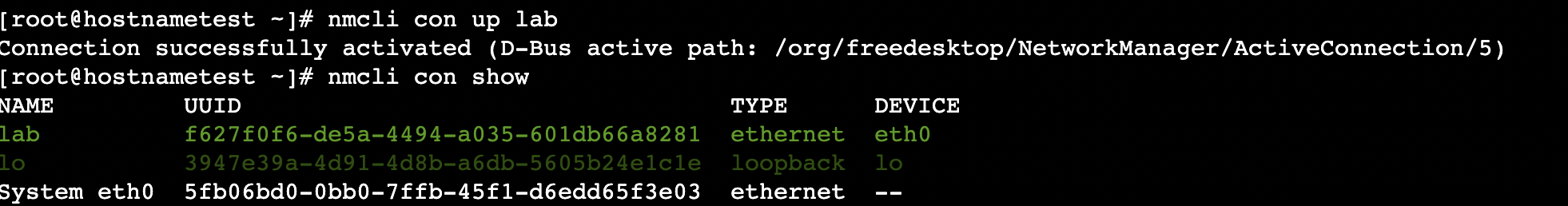 nmcli con show // lab이 제대로 추가되었는지 확인