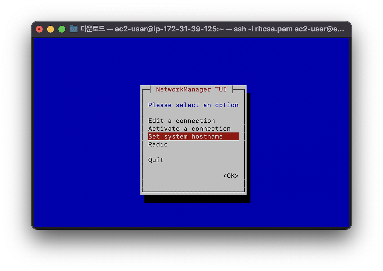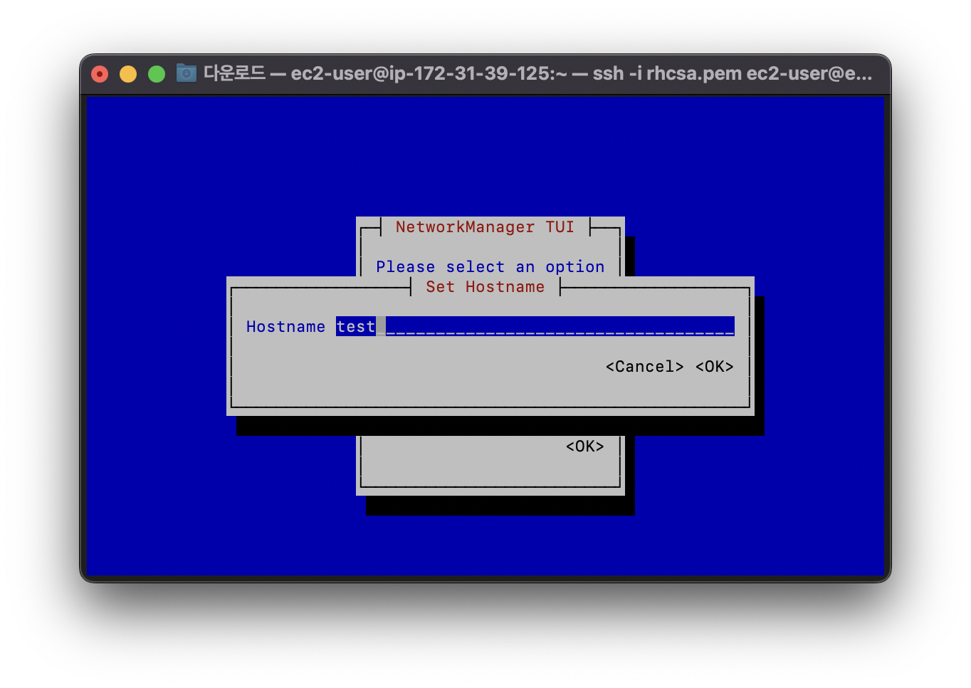 hostname 변경 > nmtui 입력 > Set system hostname 클릭 > 주어진 hostname 입력