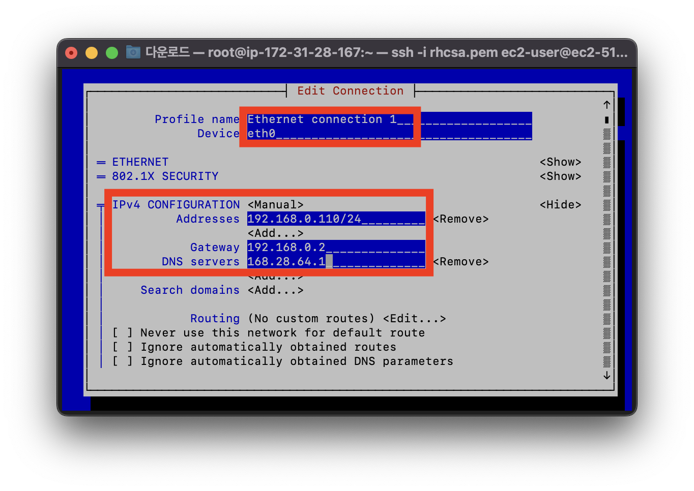 - ipv4 configuration Manual 로 변환 > Show 클릭 > Addresses(subnet도 입력해야함), Gateway, DNS servers 입력